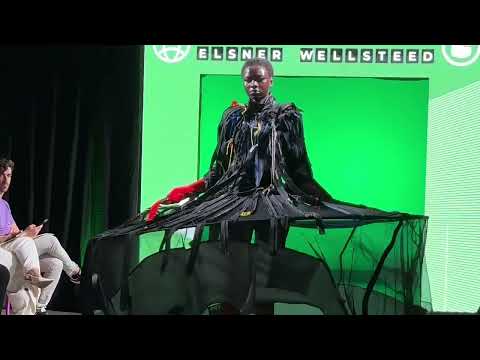 A woman wearing a yellow and green plaid blazer and a VR headset holds a VR controller in each hand.  She is standing next to a man with short gray hair who is also wearing a blazer and is looking at her.  Behind them, there are two screens; one displaying a simple graphic and the other showing a 3D model of a person wearing a helmet.